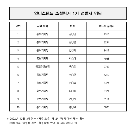 ¾ð´õ½ºÅĵ忡ºñ´º¿¡¼´Â ¡¸2022³â ¾ð´õ½ºÅĵ忡ºñ´º ¼Ò¼È¸µÄ¿ 1±â¡¹¼±Á¤ °á°ú¸¦ ´ÙÀ½°ú °°ÀÌ ¾Ë·Áµå¸³´Ï´Ù.