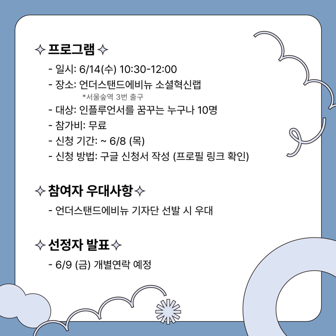 ¸¸ÆÈÇÒ¸Ó´Ï X ¿øµ¥ÀÌŬ·¡½º <¾Æ¹«Æ°, ÀÎÇ÷ç¾ð¼> 10¸í❗️Âü°¡ºñ ¹«·á❗️59³â»ý ÀÎÇ÷ç¾ð¼ ÇØÇÇÁö´Ï´Â ¾î¼´Ù ÀÎÇ÷ç¾ð¼°¡ µÇ¾úÀ»±î?±× ¿ì¿©°îÀý ½ºÅ丮¿Í ³ëÇϿ츦 °ø°³ÇÕ´Ï´Ù!🏁ÇÁ·Î±×·¥ ¼Ò°³👀👀- ³»°¡ ÀÎÇ÷ç¾ð¼°¡ µÈ ÀÌÀ¯- ¿ì¿©°îÀý ÀÎÇ÷ç¾ð¼ µµÀü±â- ÀÎÇ÷ç¾ð¼ÀÇ ¿ªÇÒ°ú Ȱµ¿ »ç·Ê °øÀ¯- ÀÚÀ¯·Î¿î À̾߱⠳ª´®** °»ç : 2.7¸¸ ÆÈ·Î¿ö º¸À¯ ÀÎÇ÷ç¾ð¼ ÇØÇÇÁö´Ï🏁Âü¿©ÀÚ ¿ì´ë»çÇ×- ¾ð´õ½ºÅĵ忡ºñ´º ±âÀÚ´Ü ¼±¹ß ½Ã ¿ì´ë🏁 ÇÁ·Î±×·¥ ÀÏÁ¤°ú ½Åû ¹æ¹ý- ÀϽÃ: 6/14(¼ö) 10½Ã 30ºÐ - 12½Ã- Àå¼Ò: ¾ð´õ½ºÅĵ忡ºñ´º(¼¿ï½£¿ª 3¹øÃⱸ) ¼Ò¼ÈÇõ½Å·¦- Àοø: 10¸í- Âü°¡ºñ: ¹«·á- ½Åû±â°£: ~ 6/8(¸ñ)- ¼±Á¤ÀÚ ¹ßÇ¥: 6/9(±Ý) °³º°¿¬¶ô ¿¹Á¤- ½Åû: ±¸±ÛÆû ½Åû¼ Á¦Ãâ(https://forms.gle/Cr73HJJL7vhTF8bL9)- ¹®ÀÇ: 02-725-5526, 010-9609-5527