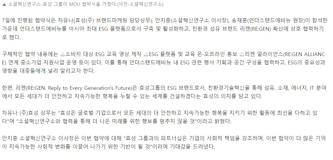 [º¸µµ±â»ç] È¿¼º-¼Ò¼ÈÇõ½Å¿¬±¸¼Ò-¾ð´õ½ºÅĵ忡ºñ´º, 'Áö¼Ó°¡´ÉÇÑ ¹Ì·¡'¿Í 'ESG °¡Ä¡ÀÇ ½ÇÇö' À§ÇØ MOU ü°á - »çȸÀû°æÁ¦´º½º